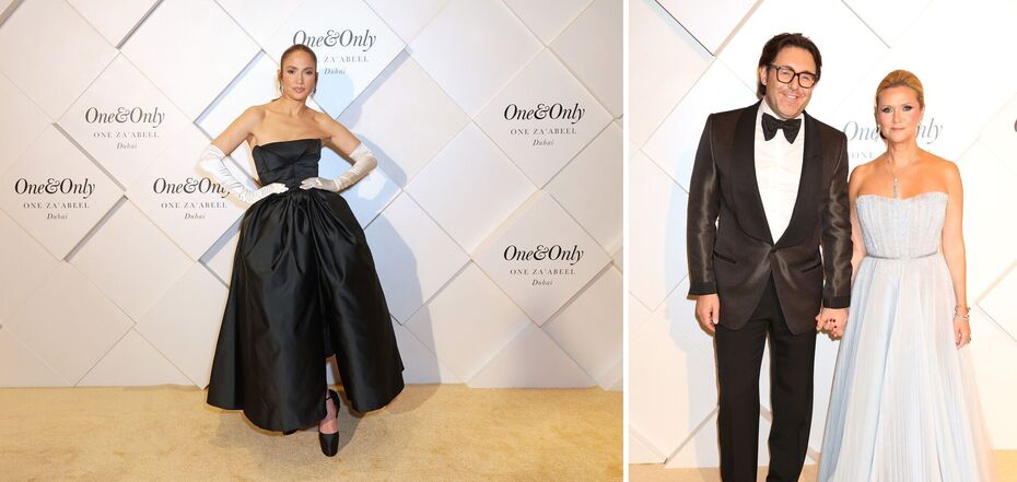 To begin with, the iconic J.Lo chose an exquisite black dress from Giambattista Valli with an interesting cut for the opening of a luxury hotel in the heart of Dubai. She complemented the look with high milky ball gloves and emerald Sartoro earrings.
