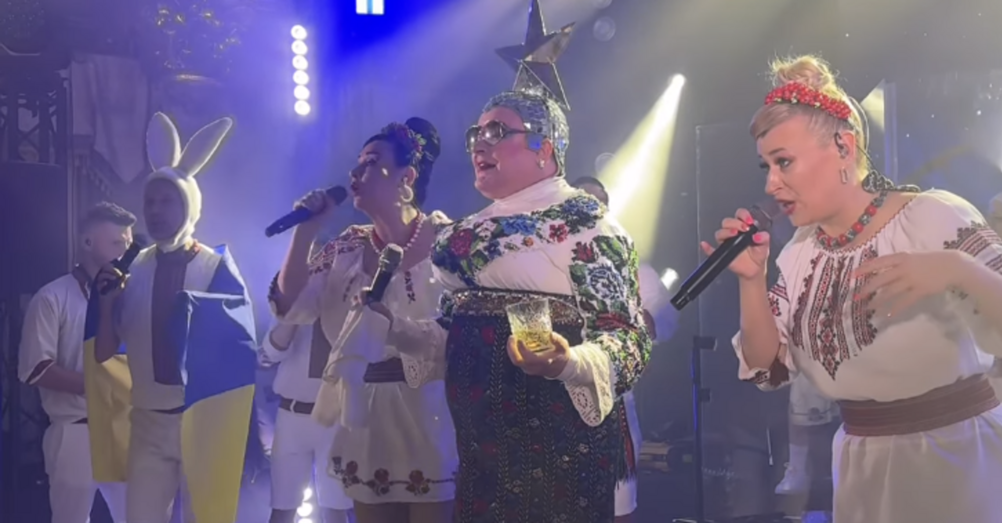 In the video, Serduchka and her team perform Ukrainian-language repertoire with the Ukrainian flag and congratulate the newlyweds.