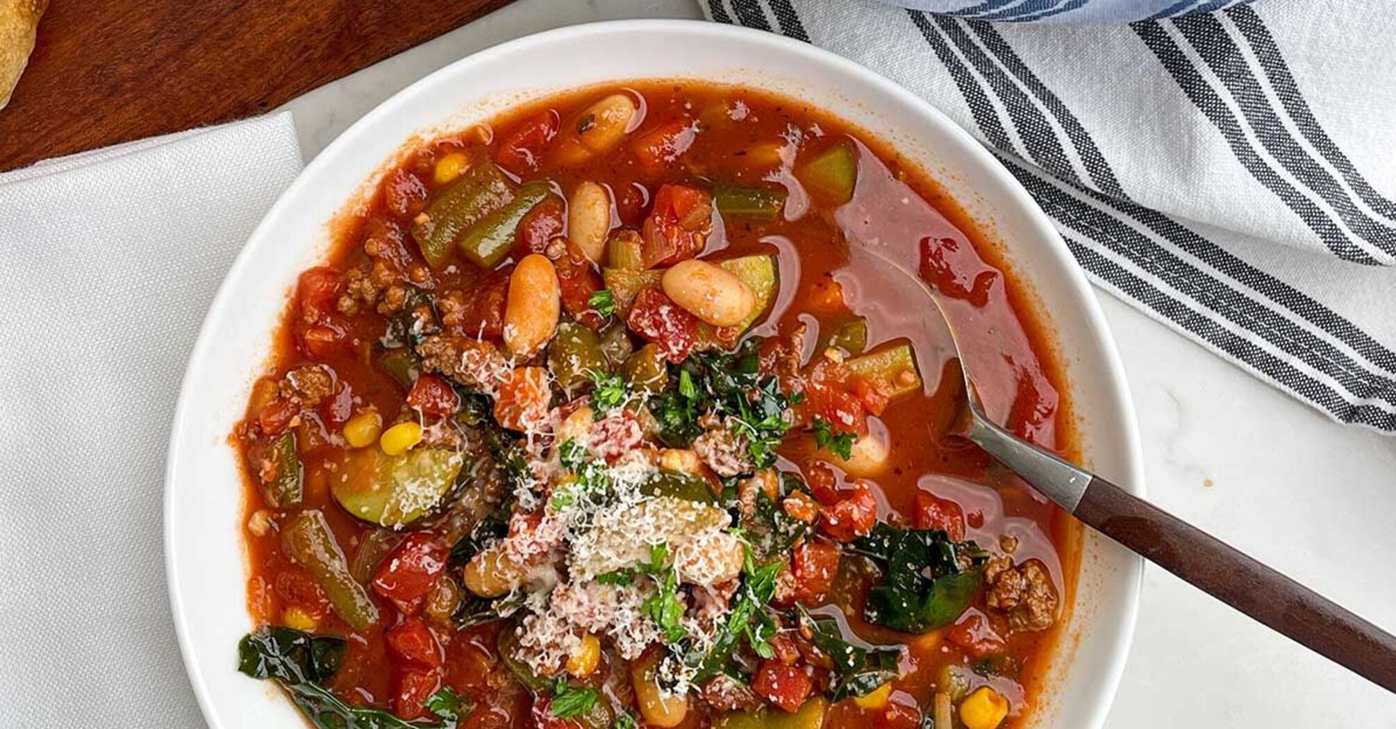 The peculiarity of this soup is that it is cooked in meat broth, but there is no need to add the pieces of meat themselves. Due to the fact that a lot of different vegetables, legumes, and cheese are added to the dish, it turns out to be very satisfying. Therefore, this soup is ideal for lunch.
