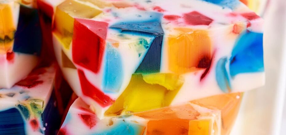 1. Pour hot water over the jelly of different colors, stir and put in the refrigerator until it is completely set.