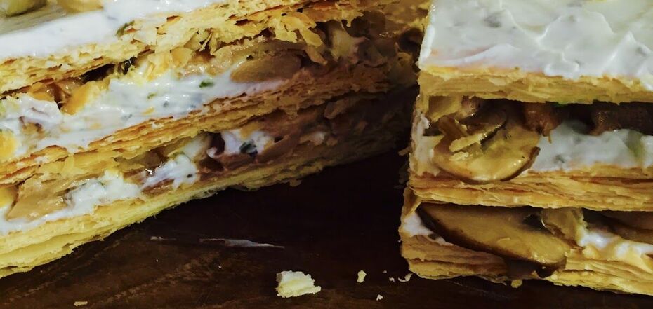We are all used to the idea that Napoleon is a sweet cake with custard. But if you make delicious sauce from garlic, herbs, and tuna inside instead of the sweet filling, you'll get a very satisfying festive appetizer. You don't have to make the dough yourself: you can just buy it.