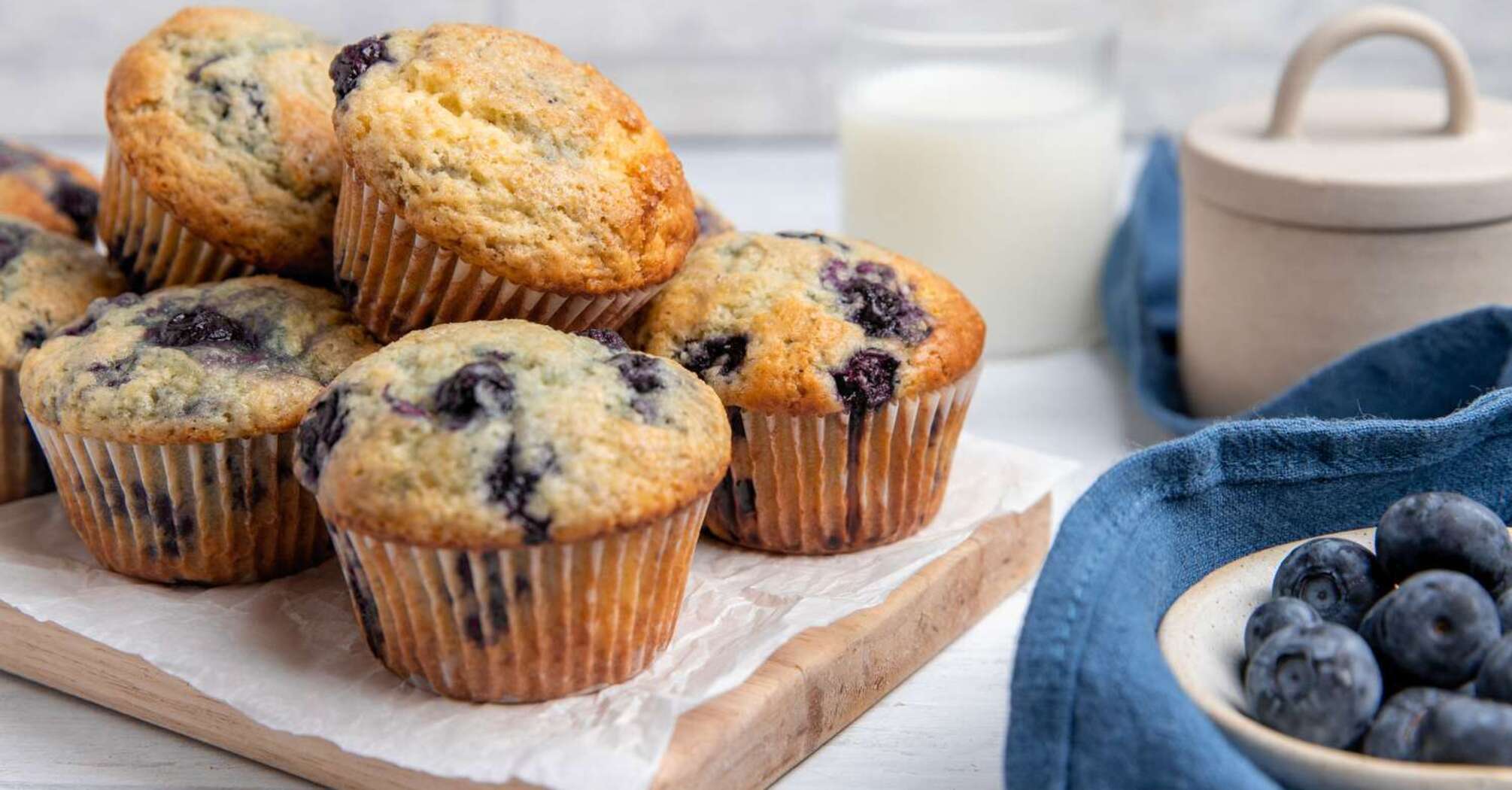 Puffy seasonal muffins with blueberries: a delicious crispy crust on top.