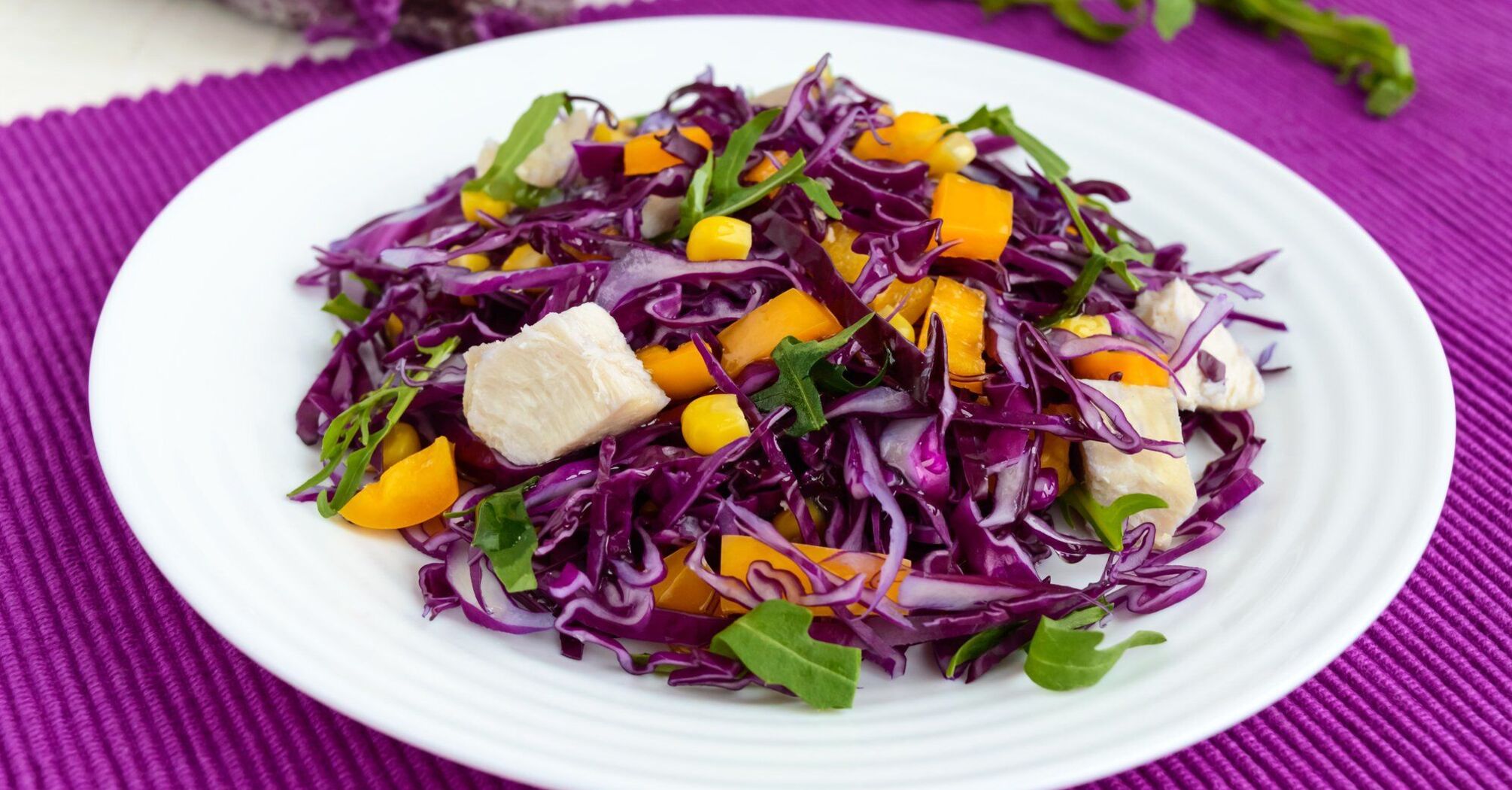 Red cabbage salad is bright, juicy and vitamin-packed. It can be supplemented with other vegetables, herbs, eggs, garlic, and any dressing: oil, mayonnaise, or sour cream. When ready, the dish is perfect for side dishes: meat, fish, or potatoes, and you can also eat the salad on its own for a snack.