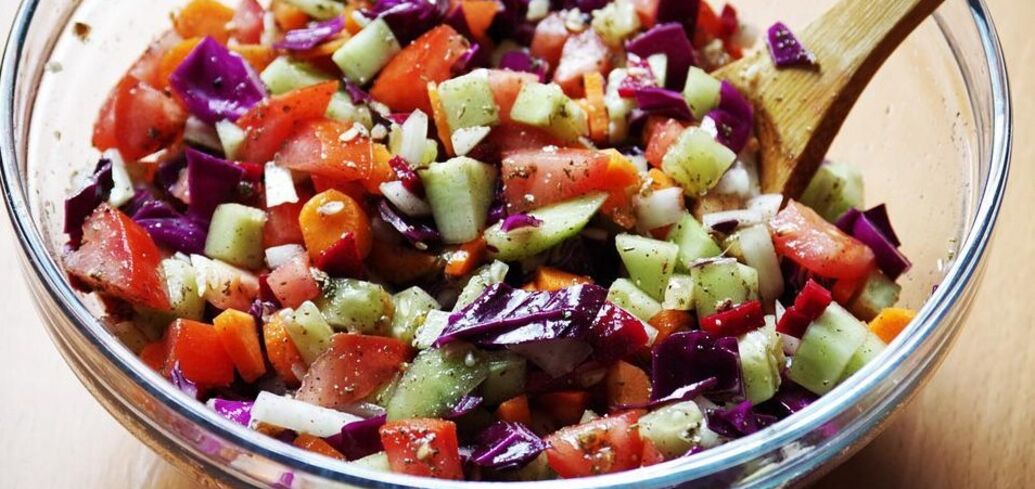 Georgian salad is exactly what you need. It contains a lot of spices, eggplants, bell peppers and boiled chicken. This masterpiece is dressed with olive oil.