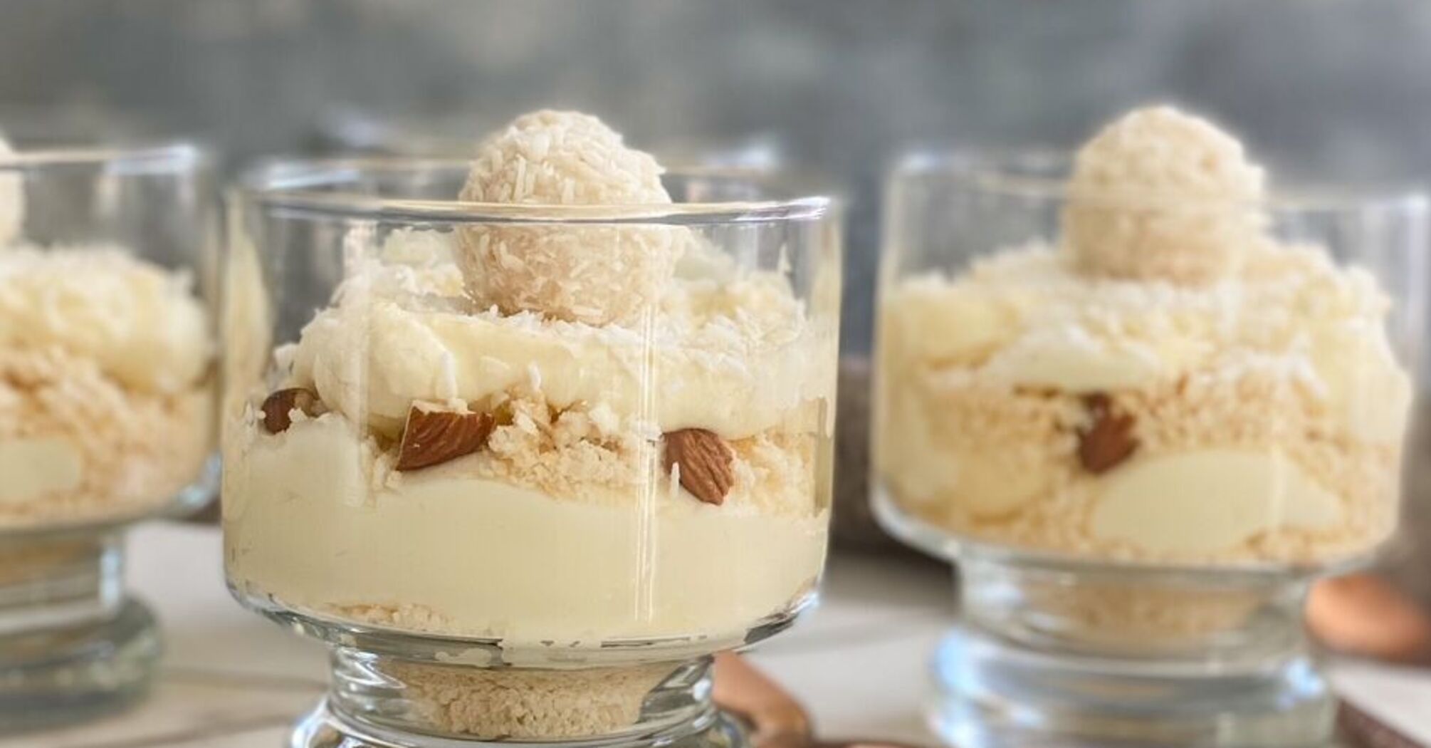 Raffaello is the perfect dessert for any celebration. You don't need an oven to make it. And it is served in an ordinary glass. For the base, you will need regular wafer cakes.