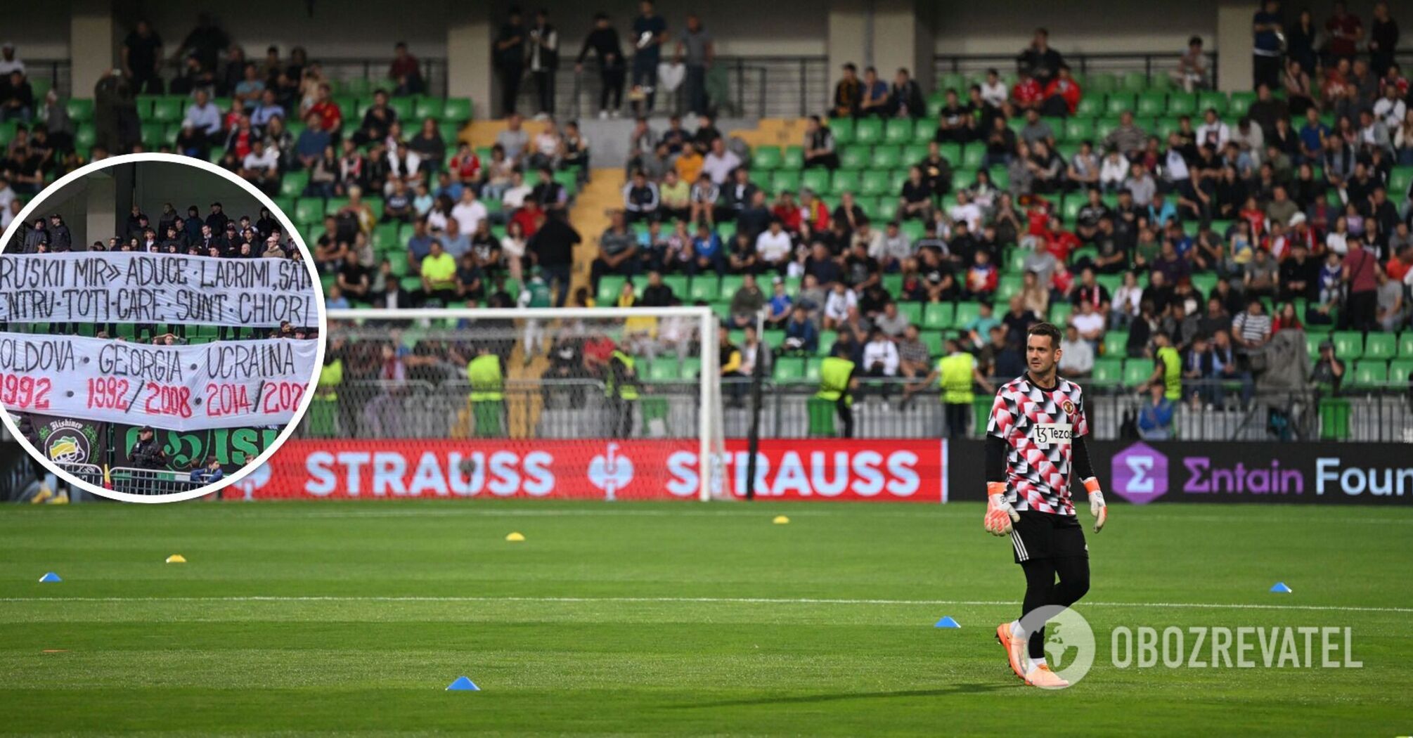"Russian World brings tears, blood and horror to those who are blind". Anti-Russian banner hung at football match in Moldova