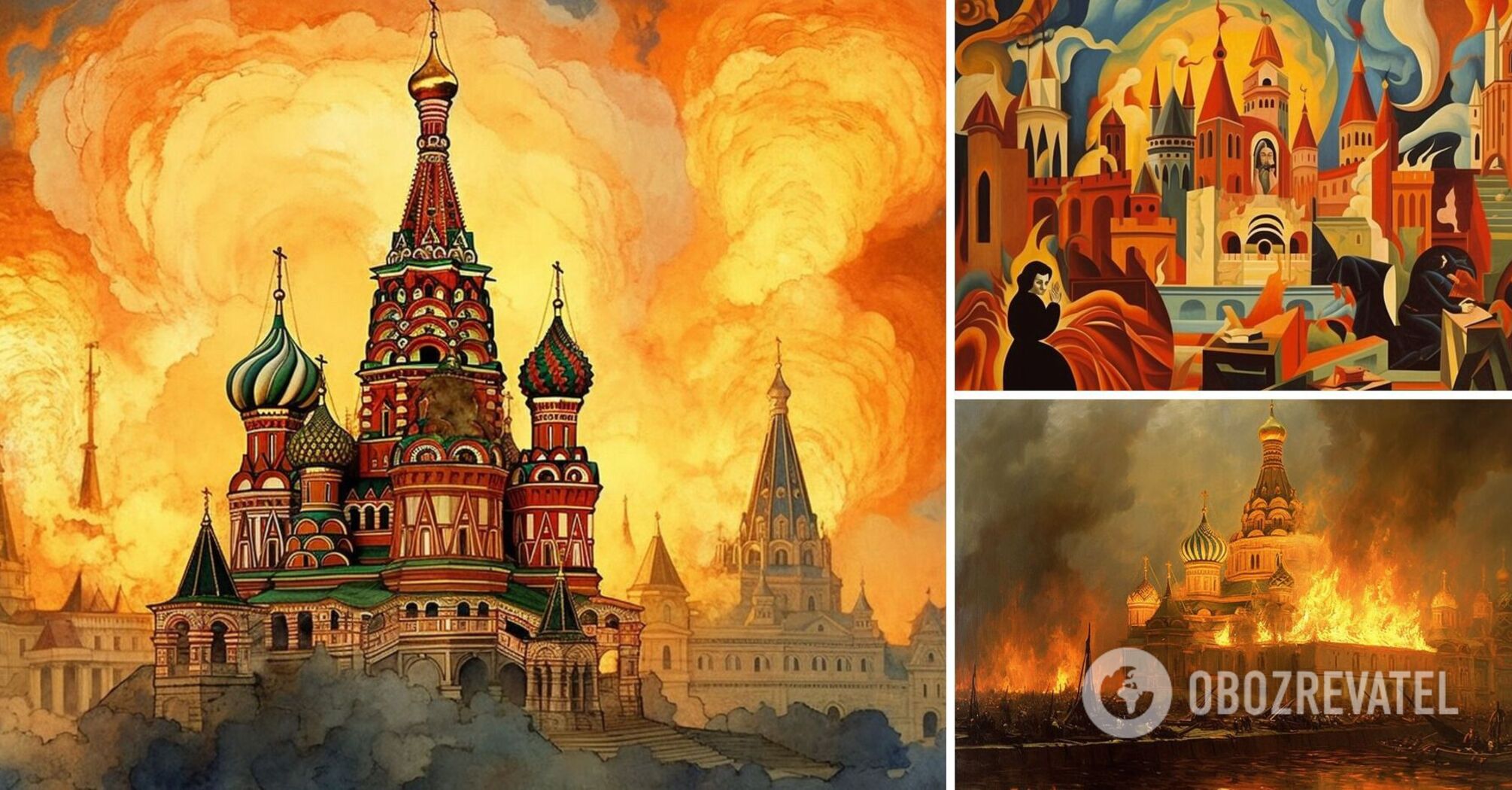 This resulted in several dozen images in a wide variety of styles - the Impressionism of Claude Monet and Auguste Renoir, the post-Impressionism of Vincent van Gogh and Henri Toulouse-Lautrec, the Art Nouveau of Alphonse Mucha, the surrealism of Salvador Dali, the symbolism of Edvard Munch, the supermatism of Kazimir Malevich, and so on. All the works are united by the theme of fire destroying the center and the key symbol of the modern Russian Federation.