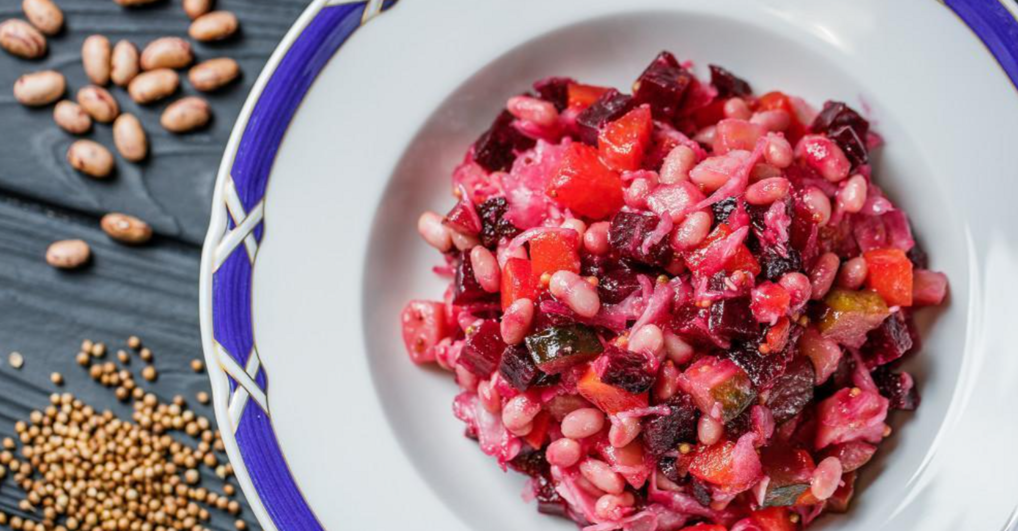 Vinaigrette is a tasty salad without mayonnaise based on vegetables, the main ingredient of which is beets. Very often the dish is supplemented with sauerkraut, beans, mushrooms and even herring, which gives the salad an original taste.