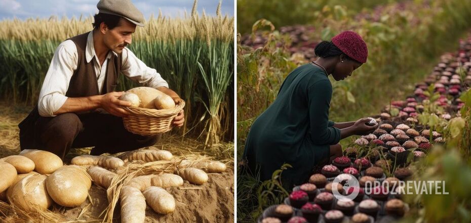 His project is titled "A World Where Everything Is Grown, Not Manufactured." He created all the images using the Midjourney neural network. They depict villagers from all over the world harvesting very unusual crops of ready-to-eat food, ranging from simple bread to bacon, burgers, chips, pizza, candy, and beer.