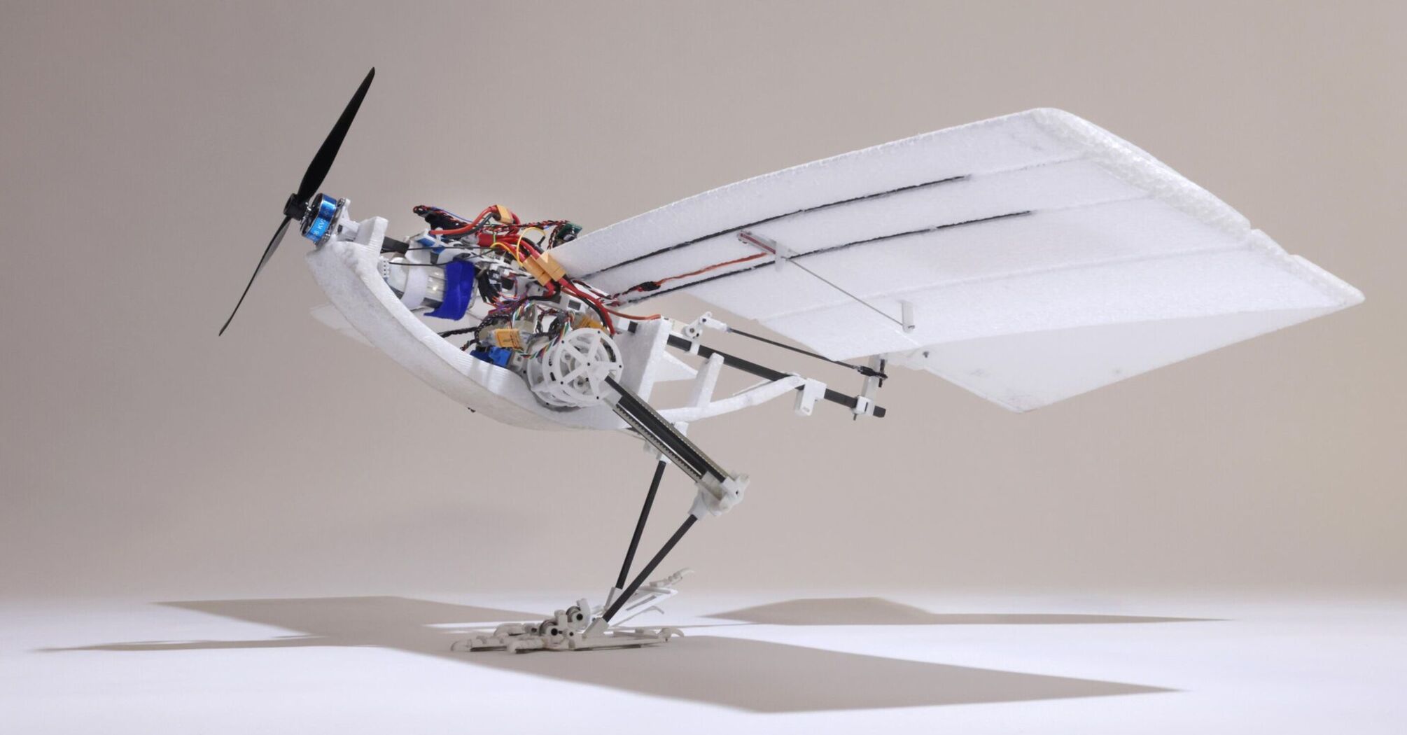 To simplify the robot, the scientists chose a fixed-wing design for flight. The engineers also decided to use a V-shape for the tail. The engine in front was driven by a single propeller.