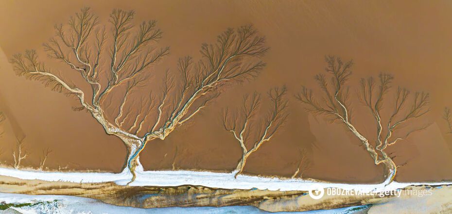 Tree-shaped patterns appear on the frozen Qiantang River in China. This incredible natural phenomenon has been repeatedly recorded on this river in winter.