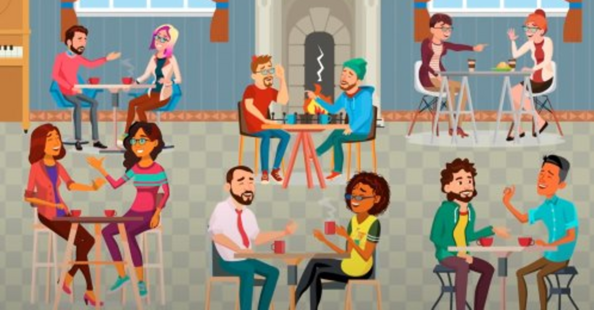 It shows a coffee shop where people are having a date and meeting friends. At first glance, it seems that all the characters in the image are ordinary people. However, a really observant viewer will notice one detail that gives away the impostor - the robot.