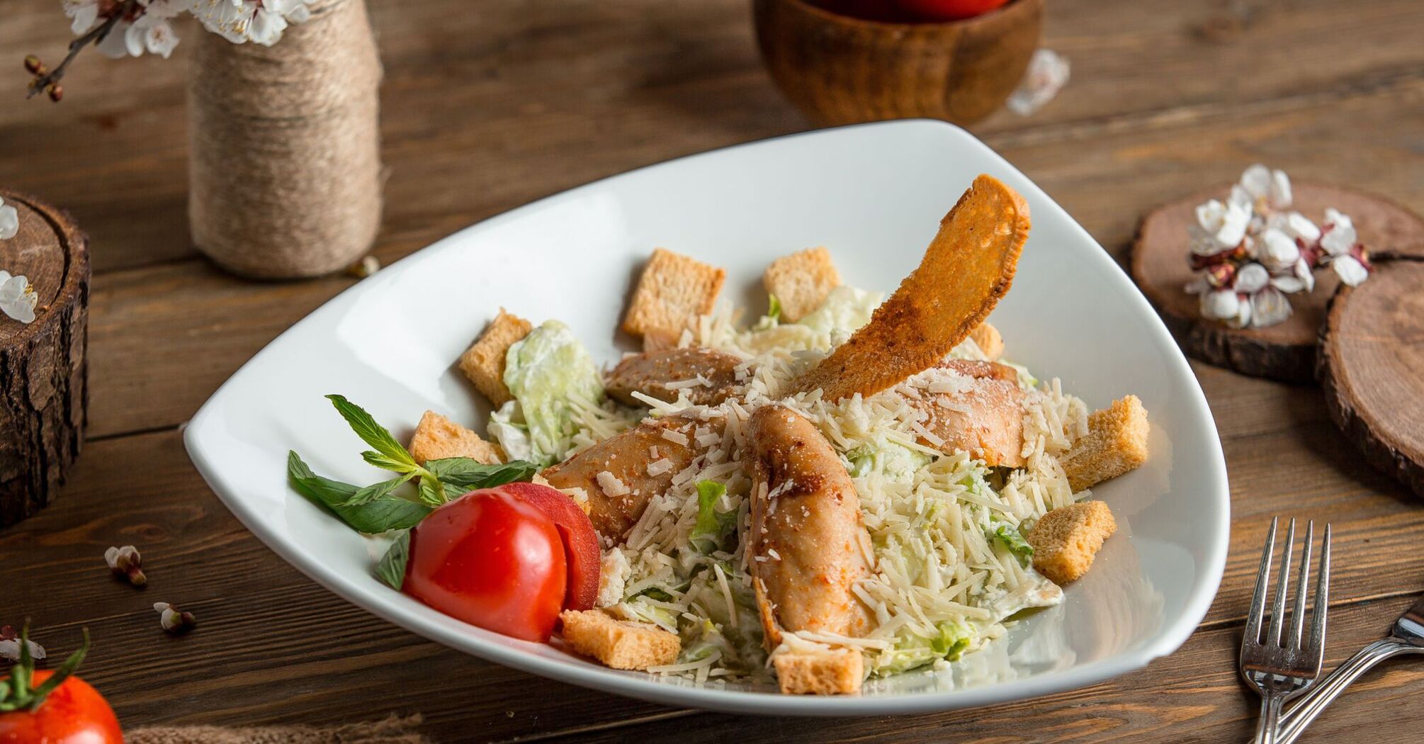 7. Mix the salad, add the chicken and sprinkle with croutons and lemon wedges.