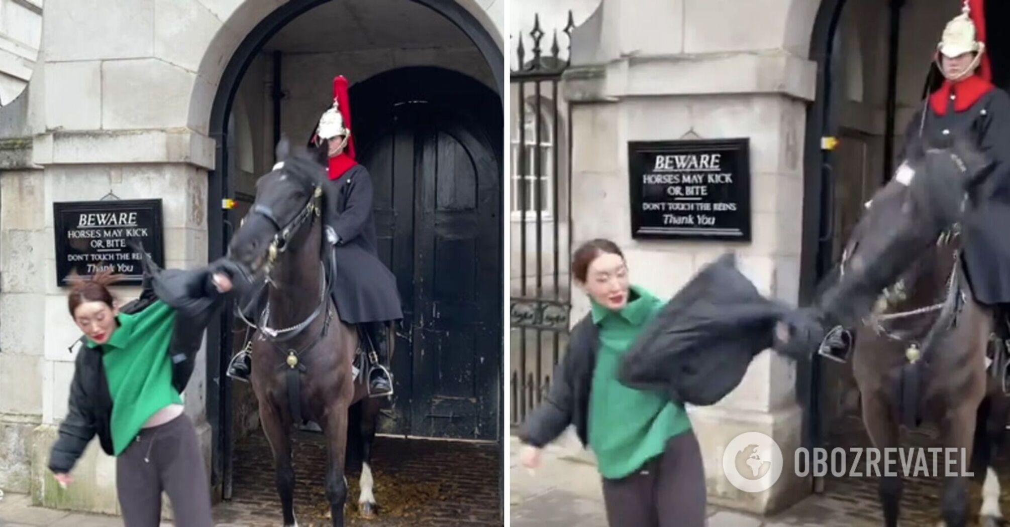 In London, a horse of the Royal Guard bit and tore off a tourist's coat as she posed for a photo in front of a symbolic sign