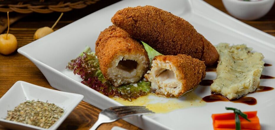 To make sure that the chicken meat is not dry, make rolls out of it. Be sure to add plenty of grated cheese and mushrooms to make the filling juicy. And to make the top crispy, add breadcrumbs.