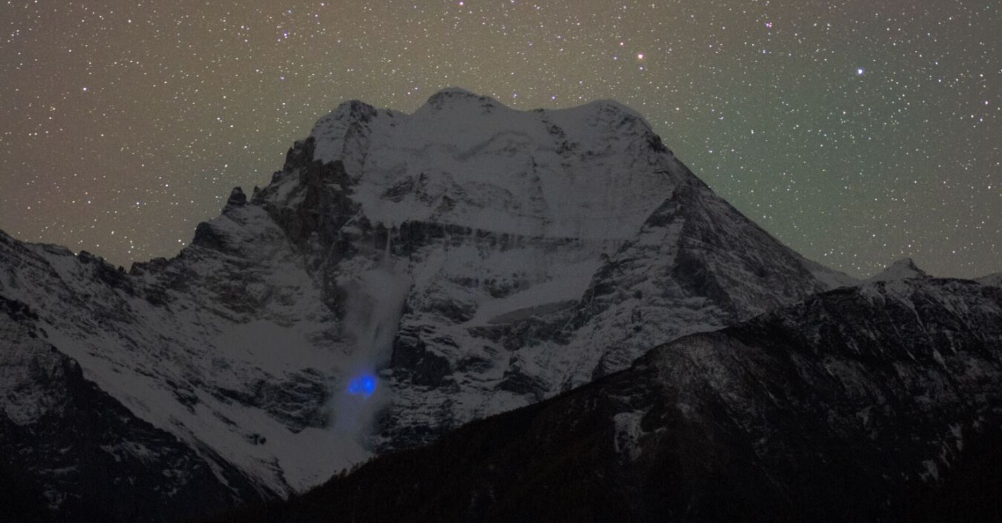 An astrophotographer was trying to create a frame-by-frame shot of the trails of stars behind Mount Xiannairi in Sichuan Province, China. However, he accidentally caught a strange blue light emitted by an avalanche.