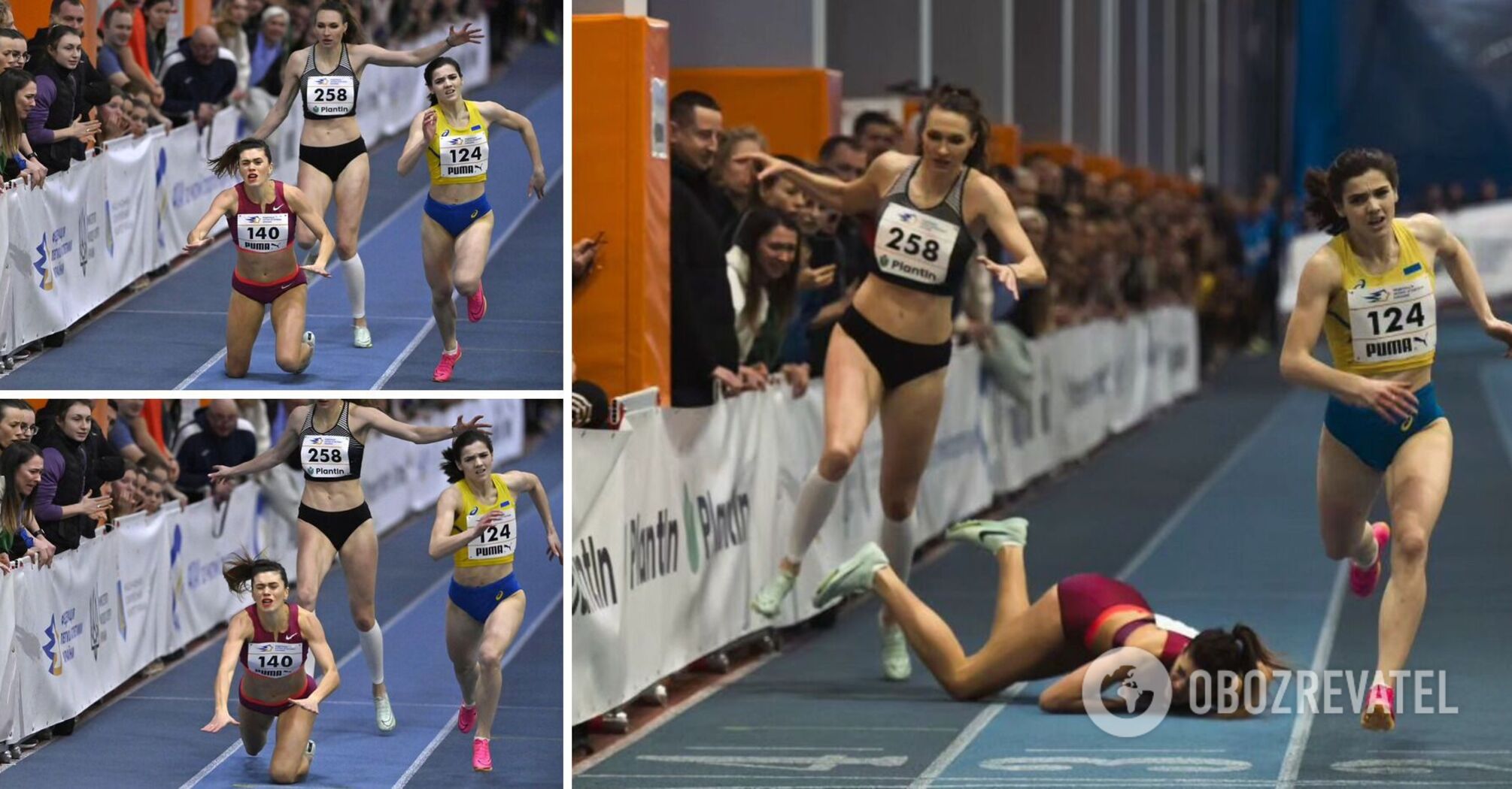 The Ukrainian athletics champion fell face first to the floor one meter before the finish line, depriving herself of victory. Video.