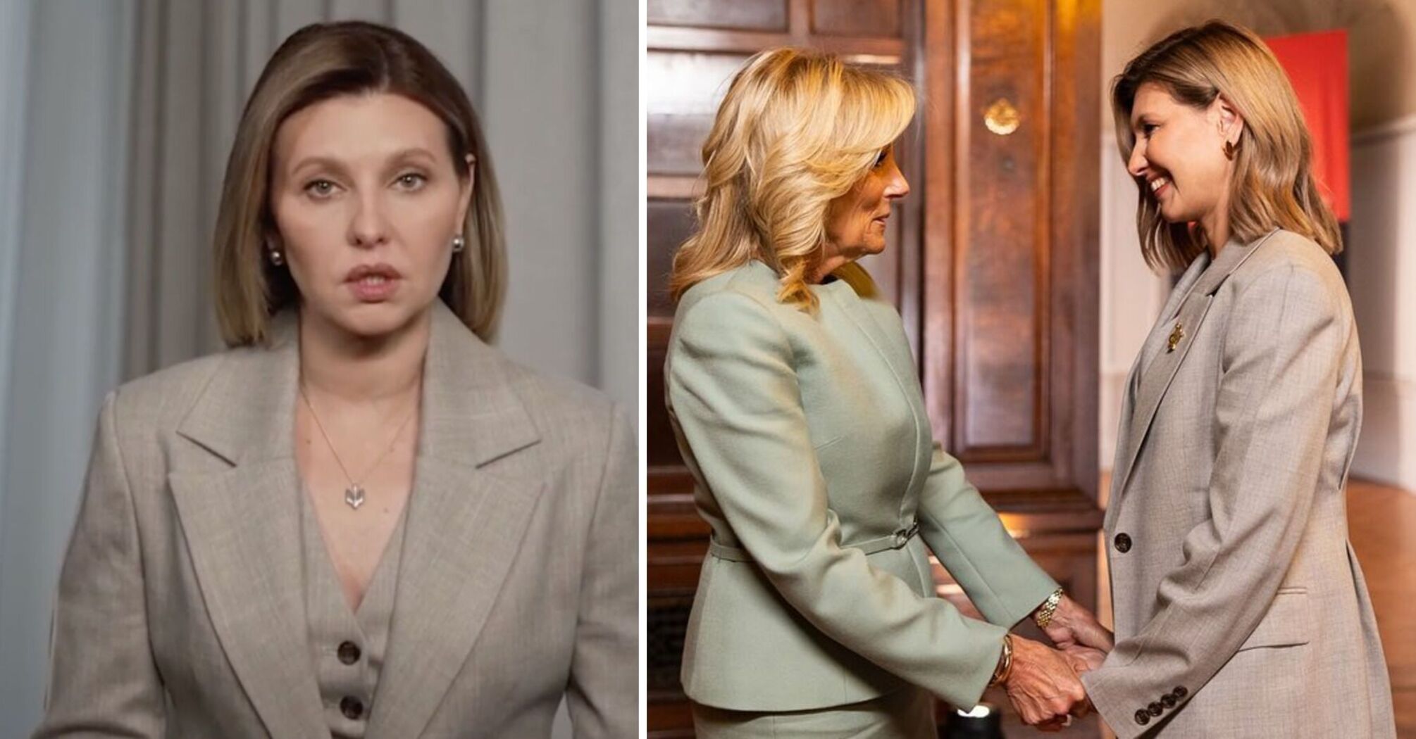 Olena Zelenska appeared in a beige and gray outfit consisting of pants, a jacket and a vest. The Ukrainian complemented her look with an iconic pendant - a Ukrainian trident. Previously, she used to wear a symbolic brooch on her lapel.