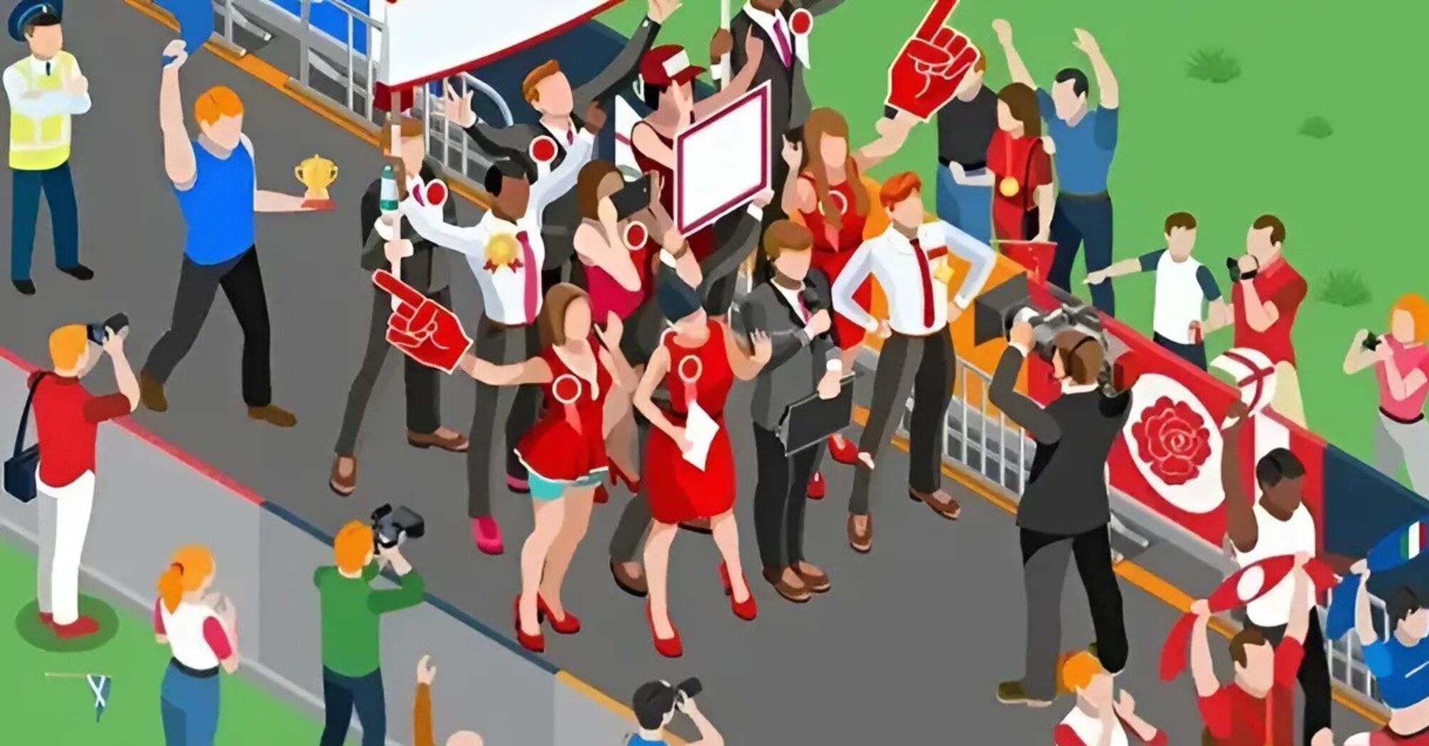 In the image, we see a lot of people celebrating the victory. Pay attention to the medals and cups that can get lost among other objects.