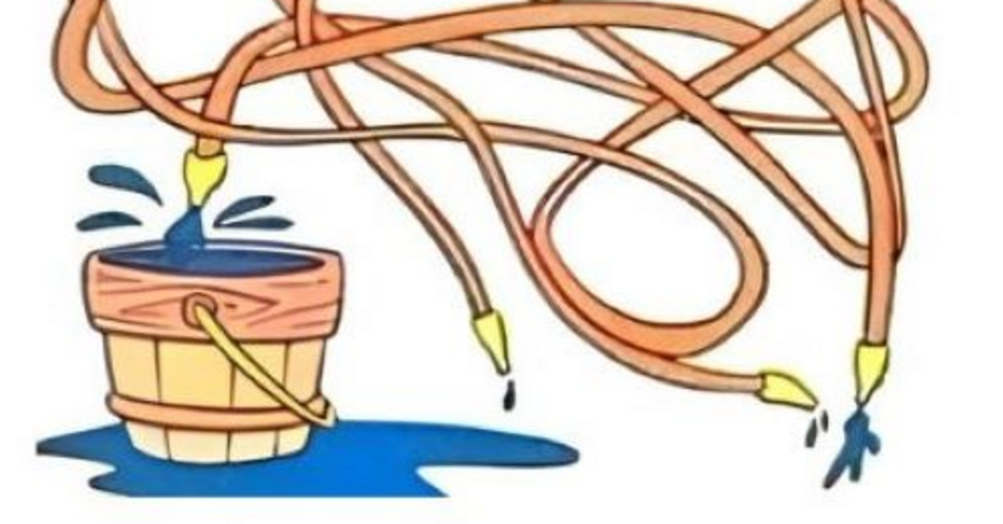 Look closely at the image as a whole. You see a bucket of water and four hoses. Each of the hoses is connected to a faucet - red, blue, green, and yellow. However, three of the hoses are connected to a tap - red, blue, green, and yellow - and only one is directed into the bucket. Try to figure out which tap this hose is connected to in the allotted time.