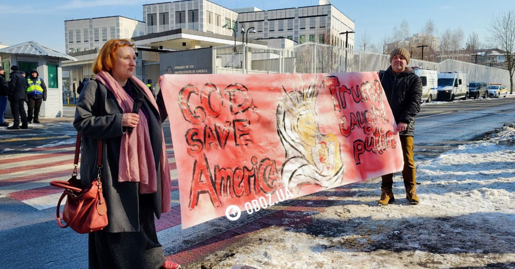 According to an OBOZ.UA correspondent, people came to the rally with posters reading "God Save America," "Reagan would hate this," "Trump promised justice, but now he has sided with the aggressor, Russia," and so on.