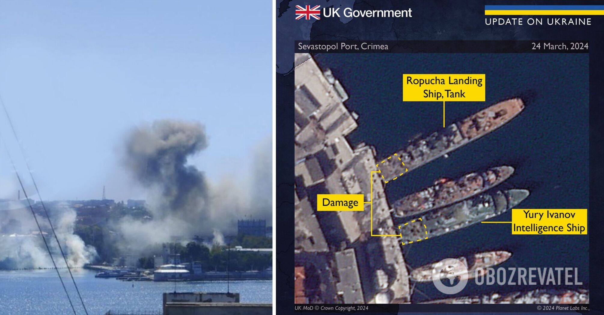 "Two "Ropukha"-class amphibious assault ships, tanks, and one "Yuri Ivanov"-class reconnaissance ship were also damaged as a result of these strikes," the review says.