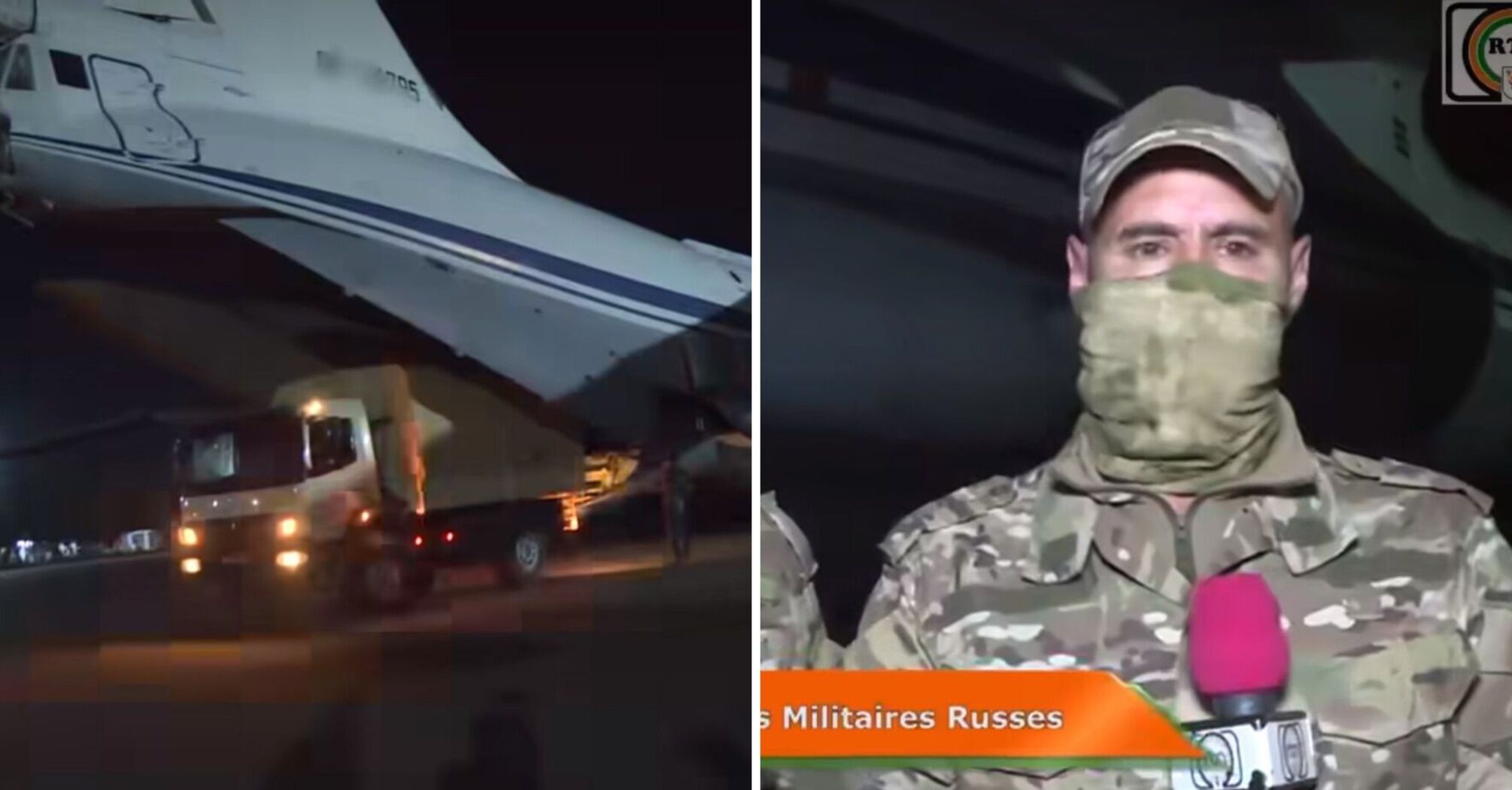 The TV also showed footage of a military cargo plane unloading equipment, with uniformed men standing next to it.